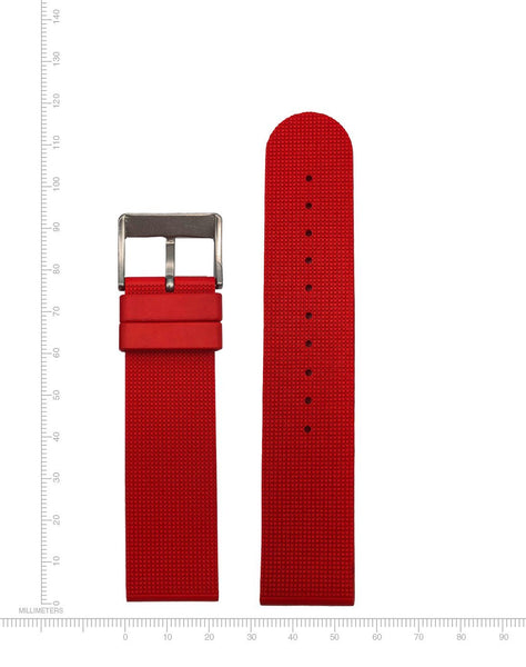 The GOMA band is made in Italy, from strong, stretchy natural rubber, with a smooth "no holes" shape. The holes are deliberately tooled only halfway through the band, so you use the buckle to "punch through" a hole for the best fit... the rest of the band remains smooth and understated, with no holes showing on the top side of the band. The back is textured for better breath-ability. Completely waterproof: just wash with soap and water if it gets dirty. Great color watch bands are not only for women.
